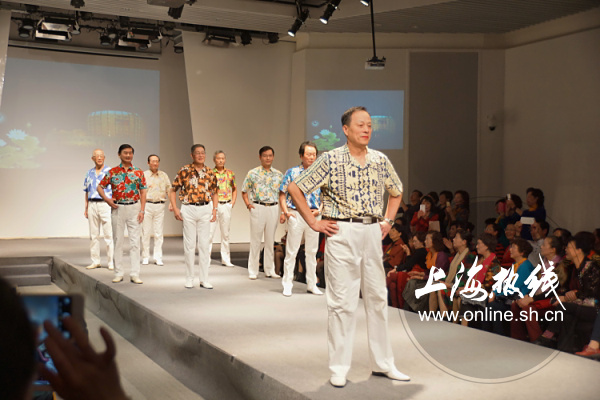 70岁的模特何文德说,为自己选了一件蓝色衬衫参加休闲服系列的表演,当记者问及这样出挑的颜色如何与队友搭配时,他风趣地说,“短袖、花衬衫足够让大家保持队形,风格不变。”