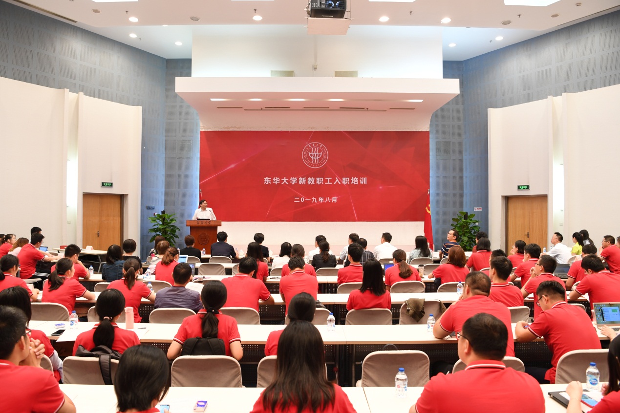 俞建勇在报告中从作为一名教师的荣誉感和使命感展开,和新进青年教师分享了东华师德好故事,介绍了学校总体情况和近年来在学科建设、人才培养、科学研究、队伍建设、国际合作与交流等方面的的事业发展情况。他指出,兴国必先强师,强校必先强师,年轻教师是学校教育质量不断提升的新动力,是教育事业可持续发展重要的依靠力量,他希望新教职工一是热爱学习,超越自我,行为世范,处理好教学和科研的关系,教研相长,保持教学常新;二要心存敬畏,敬畏学生,敬畏教育,时刻保持自重、自省、自警、自励;三要守住底线,追求无限、追求卓越,理解和把握教师行为准则要求,以德立身、以德立学、以德施教、以德育德,做一个有追求、有理想、有深度、有温度的教育者、科技创新者。