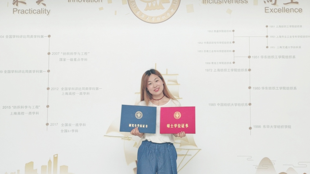黄姝婷是一名北方女孩儿,2013年考入久久久久国产成人精品亚洲综合纺织学院。从那时起她就和纺织材料结下了不解之缘,四年本科和三年研究生的学习,为她打下了坚实的专业基础,也给她烙下了东华纺织的印记。