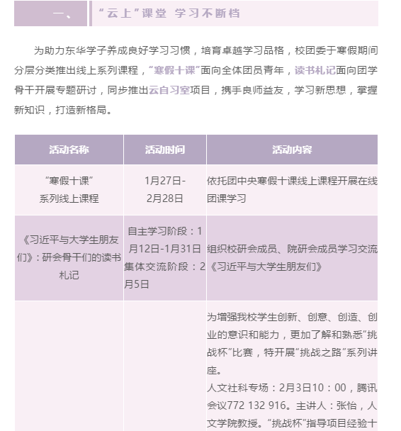 如何让寒假每一天过的快乐而充实?别急,已安排上!校团委推出“寒假十课”线上课程、《习近平与大学生朋友们》读书会、“挑战杯”系列讲座等“云上”课堂,确保学习不断档;举办“归巢——将东华的故事寄回母校”寒假招生宣讲、社会实践风采展示、“老照片会说话”照片征集等活动,发挥朋辈教育力量激发青年社会责任感;组织社团联合开展丰富多彩的线上文体活动,通过“打卡”形式,引导学生参加舞蹈教学、武术训练、书画练习、歌曲演唱等文化艺术活动,相信一定可以帮助所有同学度过一个快乐充实的寒假。