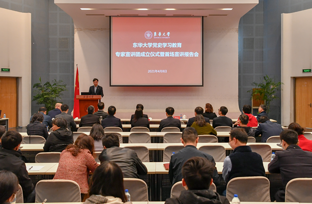 4月8日,我校党史学习教育专家宣讲团(以下简称为“宣讲团”)成立仪式暨首场宣讲报告会在松江校区举行。党委书记刘承功,校长、党委副书记俞建勇,党委副书记崔运花,副校长陈革、舒慧生等在校党政领导出席会议。会议由党委常委、党委宣传部部长任晓杰主持。