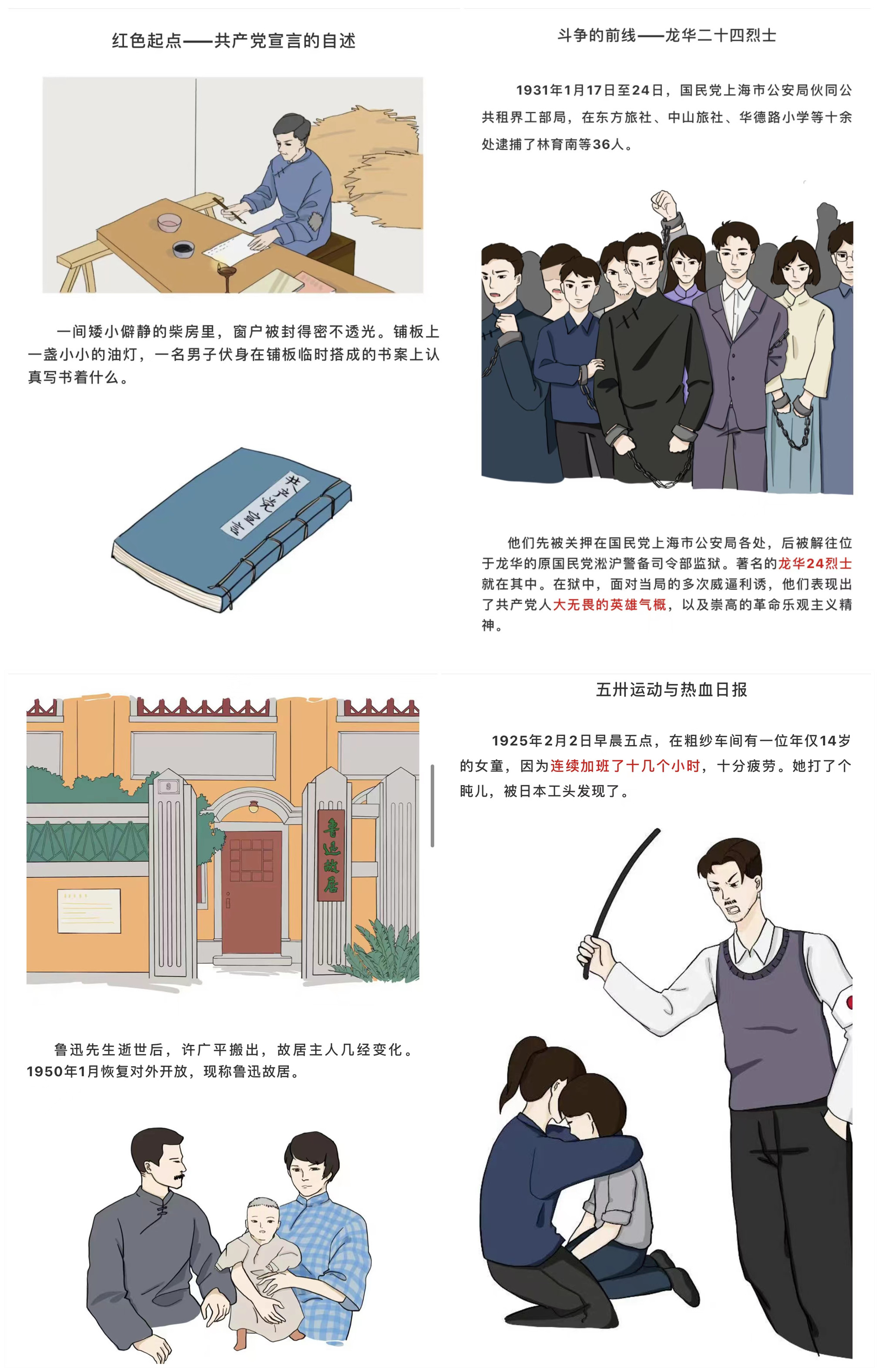 打造行走的课堂,让学习教育更灵活、更深入。组织12支党史学习教育实践团,围绕“献礼百年奋斗路·初心不改再出发”主题,实地走访党的不同时期革命旧址,手绘红色地图、红色漫画、革命英烈纪念册、录制沪语党史学习视频,打造“设计+党史”、“VR+党史”、“沪语+党史”学习新模式。