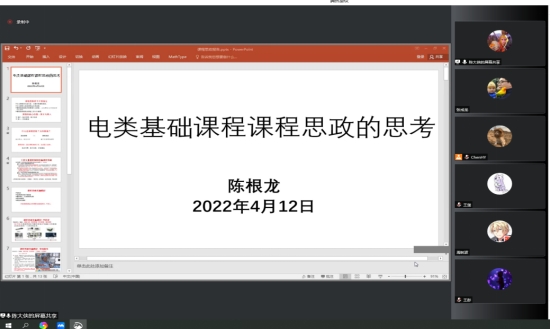 陈根龙和陈磊两位老师结合自己的教学工作先后分享了课程思政建设的心得体会。陈根龙为大家深入浅出地讲述了课程思政的具体内涵、如何在专业课程中融入思政元素,并通过典型案例讲解了思政元素应如何设计才能与专业内容紧密相连。陈磊从课程思政改革的重要性、课程思政教学案例和内容选择等方面做了经验分享。她强调,可以从知识点、哲学思想、故事、热点问题中发掘课程的思政元素,激发学生的工匠精神、攻坚克难精神和爱国精神。两位老师一致认为应通过课程思政的教与学,完成知识传授、能力培养、价值塑造的教育使命。最好的课程思政就是言传身教。随后,参会老师们纷纷交流发言,共同探讨了如何更好地在教学中融入思政元素,为课程思政建设工作建言献策,现场讨论气氛热烈。